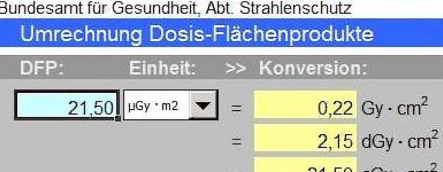 Einfaches Umrechnen der DFP-Einheiten mittels einer Excel-Tabelle. Das Dosisflächenprodukt DFP von Röntgenaufnahmen muss nach der RöV dokumentiert werden.