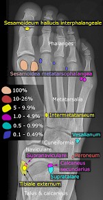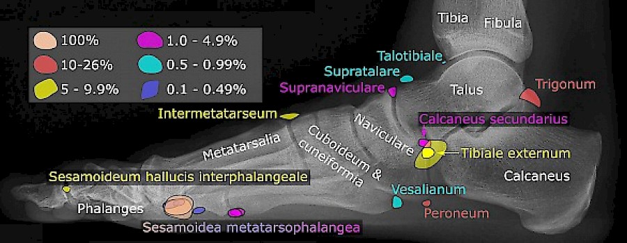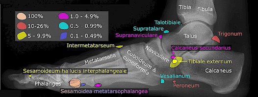 Das Os tibiale externum ist beispielsweise bei etwa einem Fünftel aller Erwachsenen vorhanden. Das Os trigonum kommt bei 3–15 % der Erwachsenen vor und das Os intermetatarseum bei etwa bei 3-5 %.