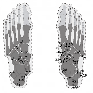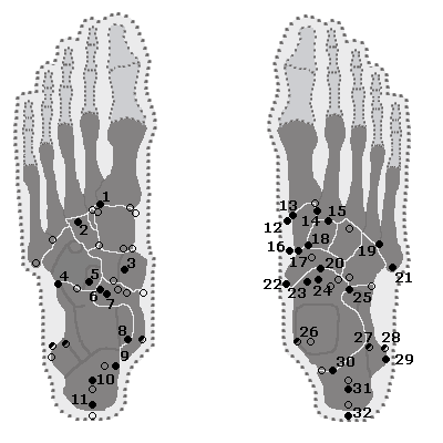 Nachstehend sind akzessorische Fußwurzelknochen aufgelistet und skizziert. Links der rechte Fuß in plantarer (von der Fußsohle, „von Unten“) und rechts der gleiche Fuß in dorsaler (vom Fußrücken, „von Oben“) Betrachtung.