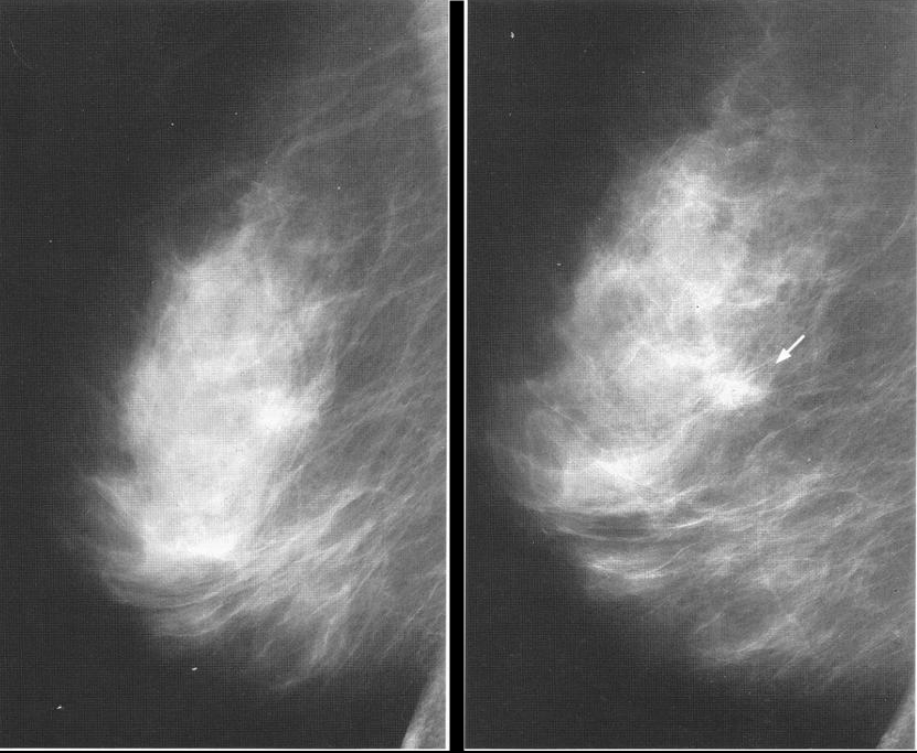 Linkes Bild: Mammographie mit schlechter Kompression. Das im Drüsengewebe liegende Karzinom ist schwer zu erkennen.