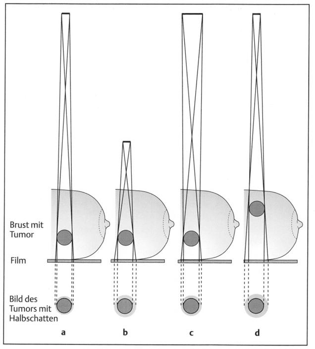 Zudem ist auf einen kleinen Objekt (Tumor)-Film-Abstand zu achten, um das Halbschattenphänomen zu verringern. Deshalb ist die Kompression der Mamma auch wichtig, da dies den Objekt (Tumor)-Film-Abstand verringert.