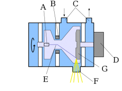 Außerhalb der Röntgenröhre befindet sich das Spulenpaket des Stators zum Antrieb des Rotors nach dem Prinzip eines Asynchronmotors. Die Elektronen treffen auf den Rand des Tellers auf.