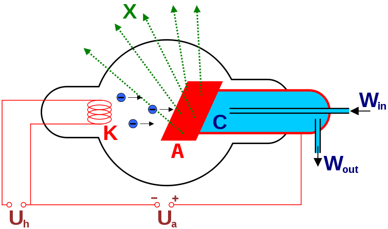 Auf Grund der starken Wärmeentwicklung (99 % der aufgewendeten Energie wird zu Wärme) muss der Anodenteller gekühlt werden.