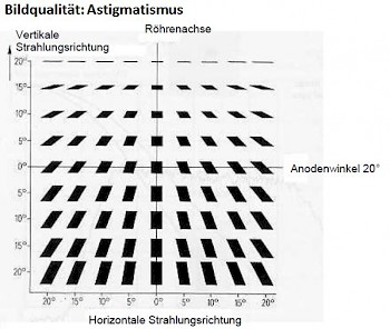 Je nach Abstrahlrichtung variiert der optische Brennfleck in Größe und Form. In Richtung der Referenzachse (Zentralstrahl) ist er z.B. quadratisch, anodenseitig verkleinert er sich zum Strich, kathodenseitig vergrößert er sich zum Rechteck. Bei seitlicher Betrachtung (wichtig bei außenliegenden Detektorkanälen in CT-Anwendungen) verzerrt er sich zum Parallelogramm.