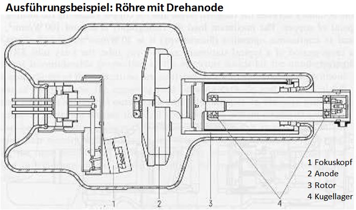Als wesentlicher Unterschied ist die Anode hier drehend gelagert, um eine gleichmäßige Verteilung der Wärme auf einer kreisförmigen Brennbahn zu erreichen – dies kann entweder durch ein herkömmliches Kugellagersystem oder ein Flüssigmetall-gelagertes Gleitlagersystem erreicht werden.