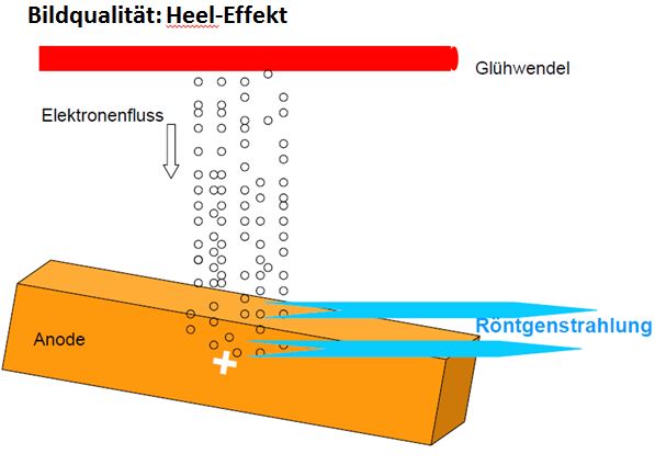 Je nach Austrittswinkel der Röntgenquanten müssen diese deshalb eine unterschiedlich lange Strecke im Material zurücklegen und werden dementsprechend geschwächt. Diese Auswirkung wird als Heel-Effekt bezeichnet.