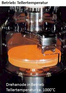 - Anode: relativ träger Wärmespeicher, der zunächst die komplette Wärmemenge aufnimmt und sie im Verlauf einiger Minuten an die Umgebung per Wärmestrahlung abgibt; maximale mittlere Tellertemperaturen bei ca. 1200 °C (nicht bei Drehkolbentechnologie).