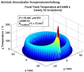 - Fokus: Kleiner, höchst beanspruchter Bereich unmittelbar im Auftreffpunkt der Elektronen mit Temperaturanstieg (Brennfleckhub) und Abklingen im ms-Bereich; Grenzen bei ca. 2600°C.