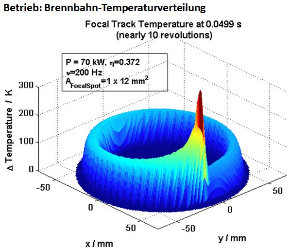 Die beschriebenen unterschiedlichen Temperaturbereiche auf einer Drehanode sind in nebenstehendem Beispiel illustriert.