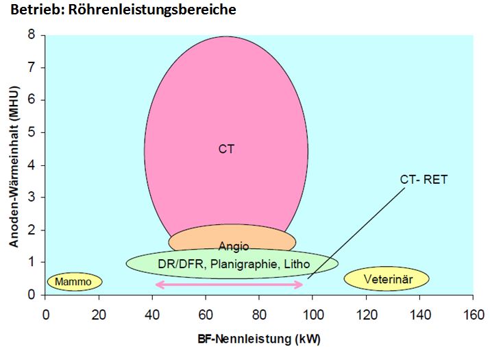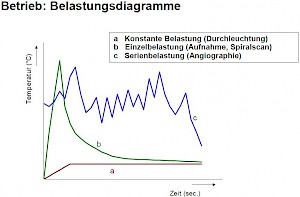 Bei der Erstellung und Interpretation von Belastungsdiagrammen von Röntgenröhren sind einerseits die Eingangsgrößen zu berücksichtigen, die den spezifischen Temperaturanstieg im Anodenteller verursachen und andererseits die möglichen Leistungsgrenzen, deren Überschreitung einen erhöhten Verschleiß bzw. eine Zerstörung der Röhre im ungünstigsten
