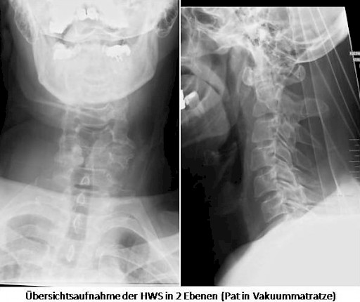 Einlieferung in Vakuummatratze. Pat. war orientiert, hatte starke Schmerzen im Nacken aber keine Sensibilitätsstörungen.