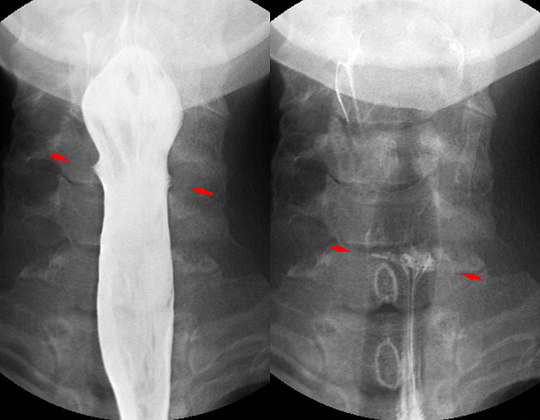 Abb.2 - Verschluckte Fischgräte quer in der Speiseröhre steckend. Links in der Röntgenbreischluckuntersuchung während der Kontrastmittelpassage, rechts nach dem Schluck nur noch schemenhaft erkennbar (Pfeile). Foto: Wikipedia