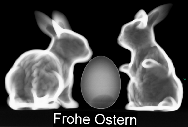 Das Bild entstand zu Beginn meines Bereitschaftsdienstes am Ostersonntagmorgen.Abgebildet sind übrigens zwei Deko-Tonhasen, die seit Jahren in unserem Bereitschaftsdienstzimmer herumstehen und mein Ostermorgen-Frühstücksei!Die Schale zeigt im unteren Anteil kleine Einbrüche. Die habe ich absichtlich herbeigeführt durch Eindrücken des unteren Anteils, damit das Ei stehen blieb.Für Nachahmer:Belichtung 50 kV 10 mAs ohne Raster am Wandstativ. Speicherfoliensystem, Die Gegenstände standen auf einem strahlendurchlässigem Bocollo-Kissen.
