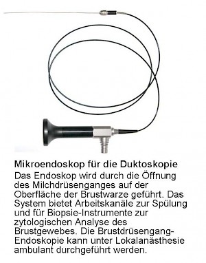 Als Ergänzung steht an einigen Zentren die Duktoskopie - eine minimal invasive Methode zur Darstellung der Milchdrüsengänge mittels eines millimetergroßen Mikroendoskops - zur Verfügung.