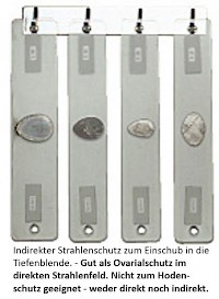 Bei der Frau ist dei Effizienz des Gonadenschutzes wesentlich geringer. Hier können zwar die Ovarien bei korrekter Lage der Abdeckung vor der Primärstrahlung geschützt werden, nicht aber vor der Streustrahlung aus dem umliegenden Bereichen. Bei entsprechender Fragestellung, wenn der Ovarialschutz die befundrelevanten Bereiche überdecken würde, muss auch mal auf den Ovarialschutz komplett verzichtet werden.