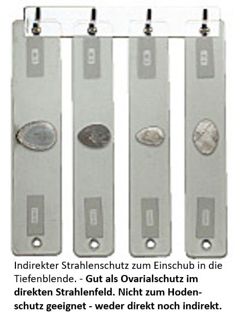 - aus einer Metallplatte, die durch verschiebbare Halterungen in den Nutschienen des Lichtvisiers an der Röntgen-Tiefenblende eingespannt wird.