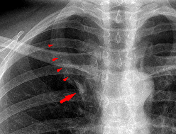 - Bild 2: Lobus venae azygos im Röntgenbild. Die Pfeilspitzen zeigen auf den zusätzlichen Lappenspalt. Der Pfeil zeigt auf die Vena azygos am Boden davon.