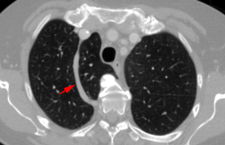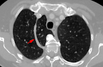 - Bild 3: Lobus venae azygos im axialen Computertomographieschnitt. Der Pfeil zeigt auf die Vena azygos, die durch den zusätzlichen Lappenspalt verläuft.