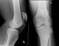 Tiefstand der Kniescheibe und deutliche Delle im Weichteil über der Kniescheibe.