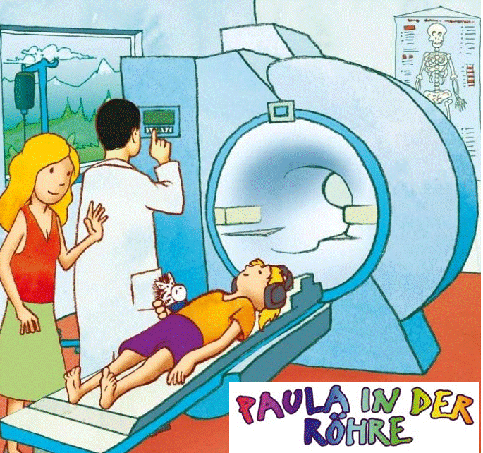 Das Buch erzählt die Geschichte von Paula, die sich beim Baden eine Kopfverletzung zufügt, die mit einer Kernspintomographie abgeklärt werden soll. Sehr schön bebildert und beschrieben steht das Buch auf der Seite www.radiologie.bayer.de bei den Elterninformationen als .pdf zum Download unter "Paula in der Röhre" bereit.