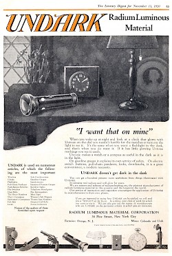 „Undark“ war eine Mischung von Kleber, Wasser und Radiumpulver. Neben Ziffernblättern von Uhren wurden auch Lichtschalter, Puppenaugen, Fischköder, Kompasse, aeronautische Instrumente, Hausnummern und Nummern von Theatersitzen mit ihr bemalt.