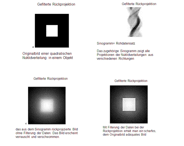 Aufgrund von Messschwankungen, die bei der Messung von Radioaktivität immer vorhanden sind, entsteht bei Rückprojektion ein völlig verrauschtes, nicht interpretierbares Bild. Deshalb ist es notwendig bei der Rekonstruktion von SPECT-Rohdaten Filter einzusetzen.