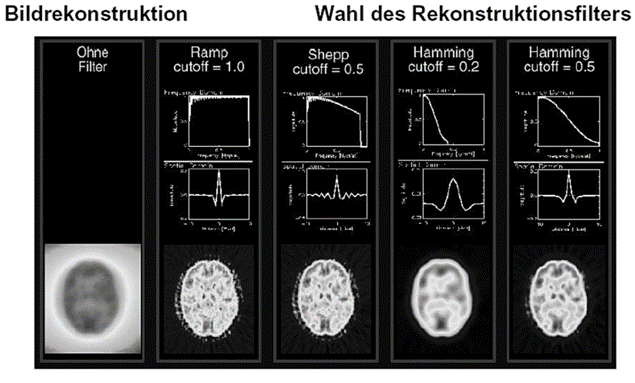 Gängige Filter, die bei der Rekonstruktion von SPECT-Daten eingesetzt werden sind: Ramp-Filter, Low-Pass-Filter, Butterworth-Filter, Hanning-Filter, Shepp-Logan-Filter, Wiener-Filter und Metz-Filter.