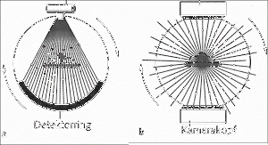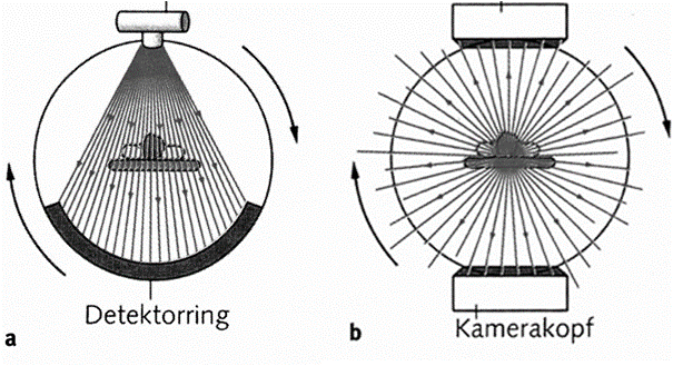 Bei der Computertomographie wird ein Röntgenfächerstrahl nach Durchstrahlung des Patienten von einem Detektorring gemessen. Röntgenröhre und Detektorring rotieren um 360 Grad
