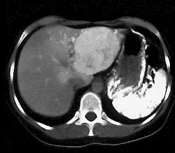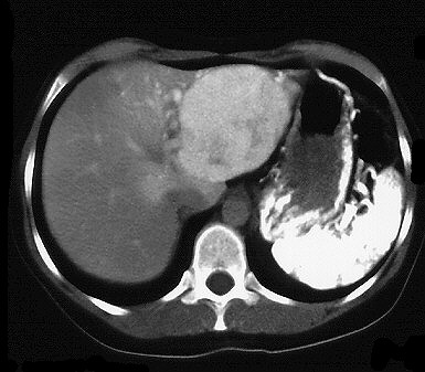 In der Nativ-CT gelangt die FNH als hypodense Raumforderung zur Darstellung, oft mit zentraler Narbenfigur. Nach i.v.-Kontrastmittelbolusapplikation ist ein biphasisches Enhancement erkennbar, die zentrale Narbe ist hypodens.