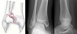 Twoplane-Fraktur: rein epiphysäres Fragment. Bei Beginn der Verknöcherung mit etwa 10 - 11 Jahren kann fast die ganze Epiphyse einbezogen sein und der Frakturspalt befindet sich weit medial (intramalleolär). Mit fortschreitendem Fugenschluss findet sich der meist sagittale Frakturspalt zunehmend weiter lateral. Zuletzt besteht nur noch ein knöcherner Syndesmosen-Ausriss mit einem ventrolateralen Fragment. Diese letzte Form wird auch Tillaux -Fraktur genannt. Bei dieser Fraktur (siehe Abb.2) handelt es sich um eine Sonderform der Malleolarfraktur mit Läsion des Tuberculum tibiale anterius (sogenanntes Chaput Tillaux).