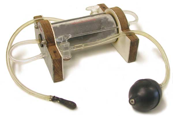 Die Mode, Wasser radioaktives Gas zuzusetzen, war aber noch lange nicht am Ende. Noch 1965 brachte die "Ionic Research Foundation" einen obskuren Apparat auf den Markt, der die Verstrahlung des Trinkwassers perfektionierte. Der "Gable Ionic Charger" (Abb. 3) bestand aus nicht viel mehr als einer mit 0,3 mCi Radium-226 gefüllten Hohlwalze aus Blei, die mit einem Schlauch und Blasebalg verbunden war.