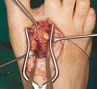 Unter Vollnarkose wird das Spatium interdigitale I/II im rechten Fuß der Patientin eröffnet. - © Universitäres Lehrkrankenhaus Feldkirch